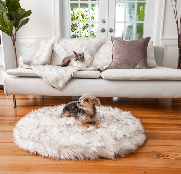 “This faux-fur dog bed doubles as a plush cream rug, keeping both your toes and your pup toasty."